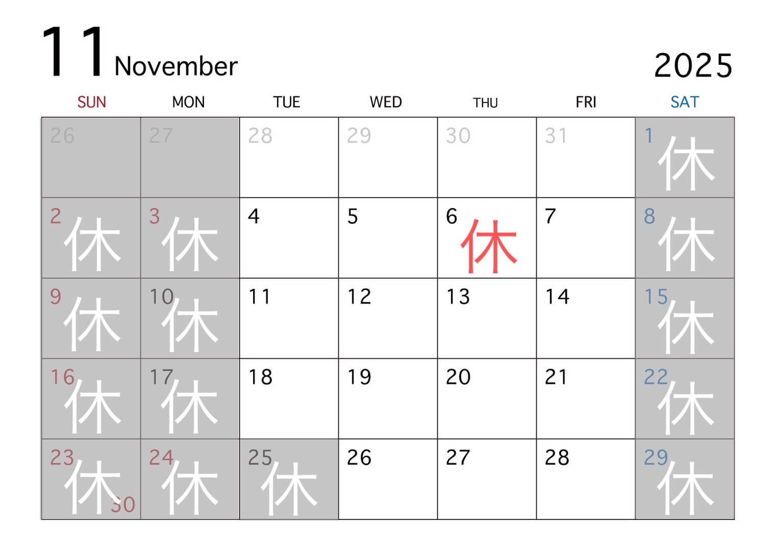 2025年10月の営業日はこちらになります。 どうぞよろしくお願いします。 今月の営業日 2025年11月6日(木)は臨時休業となります。 2025年11月26, 27, 28日は臨時休業となります。 関連記事 2025年10月の営業日はこちらになります。
