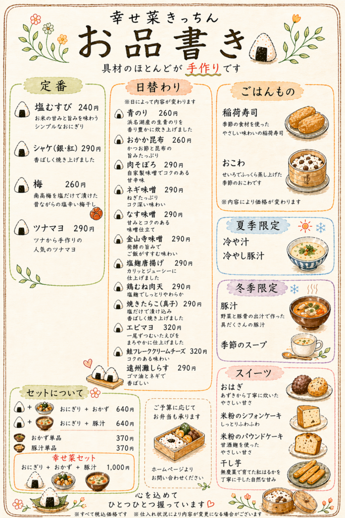 お米や食材、包材などの価格高騰が続く中、できる限り価格を維持してまいりましたが、今後も手作りの美味しさと品質を大切にしながら続けていくために、一部商品の価格を見直しさせていただくことになりました。